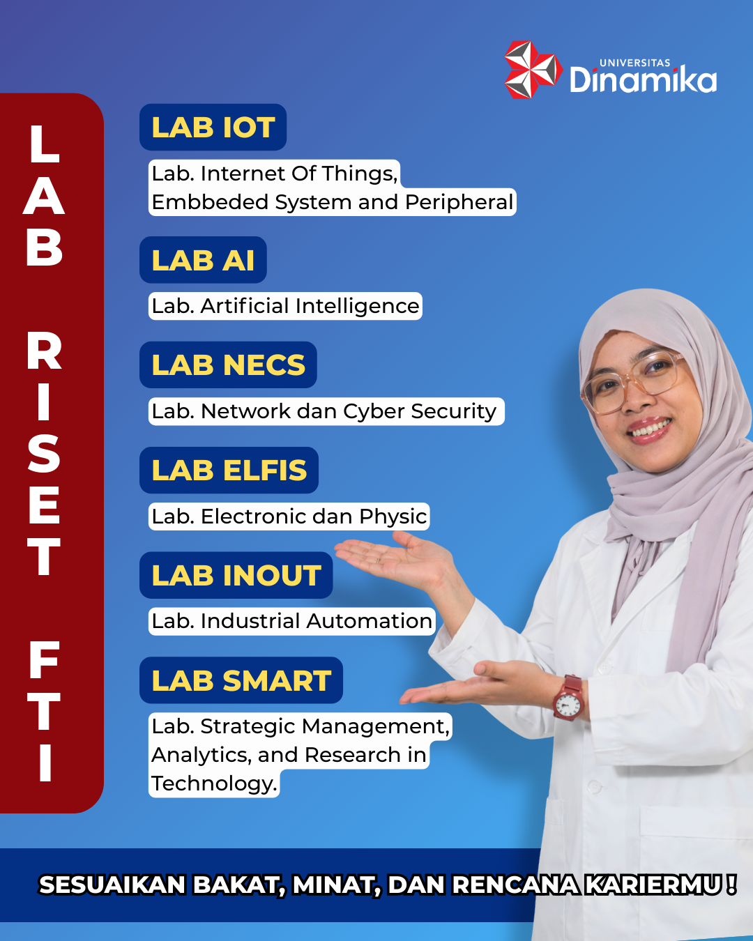 Fakultas Teknologi dan Informatika Universitas Dinamika menyediakan berbagai Laboratorium Riset (Lab Riset FTI) yang dirancang untuk mengembangkan kompetensi ma...